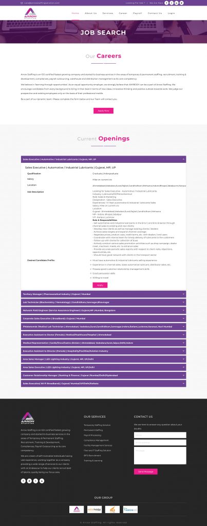 Client Arrow Staffing Pvt. Ltd. Services Website design and development for HR/ Staffing Recruitment firm